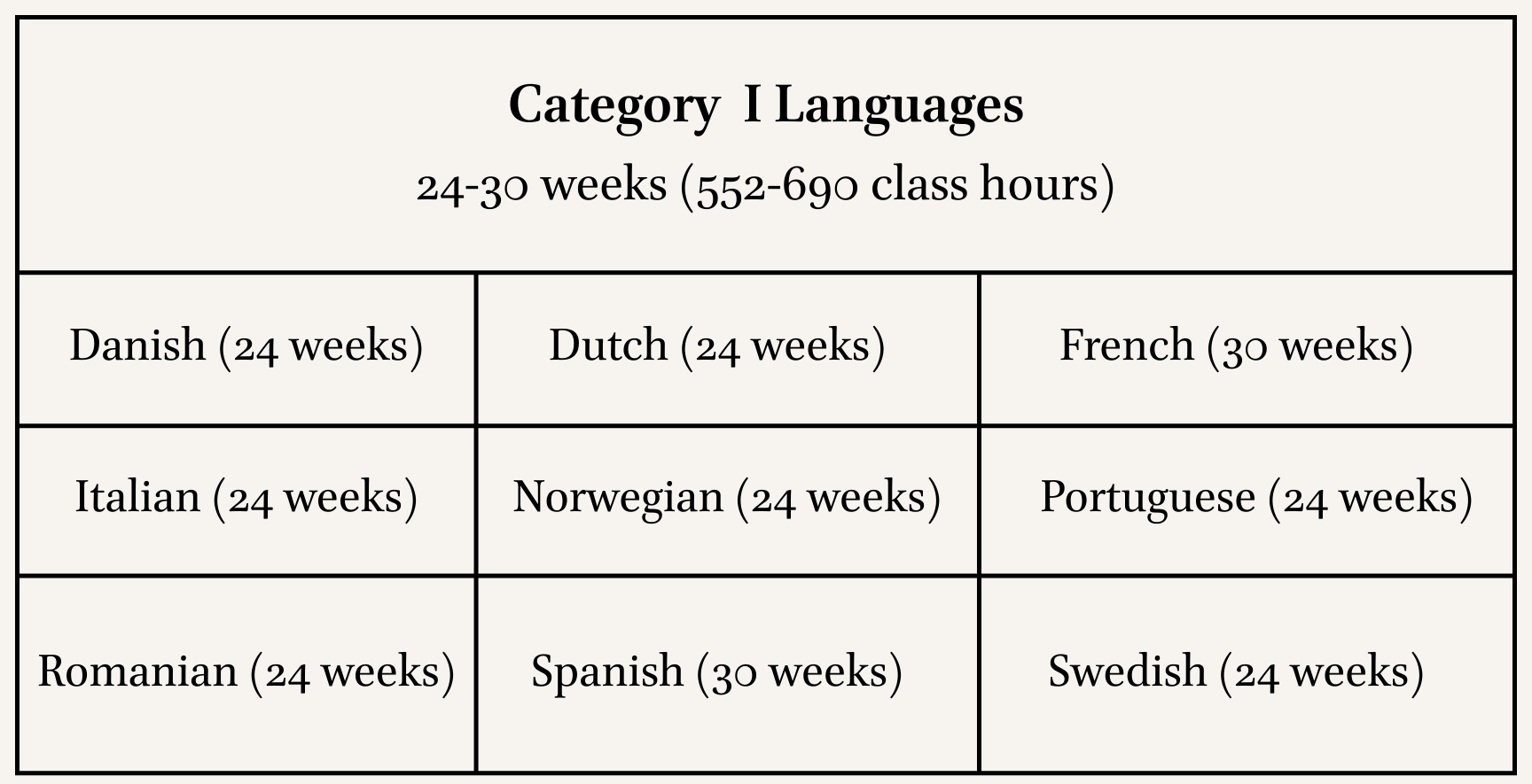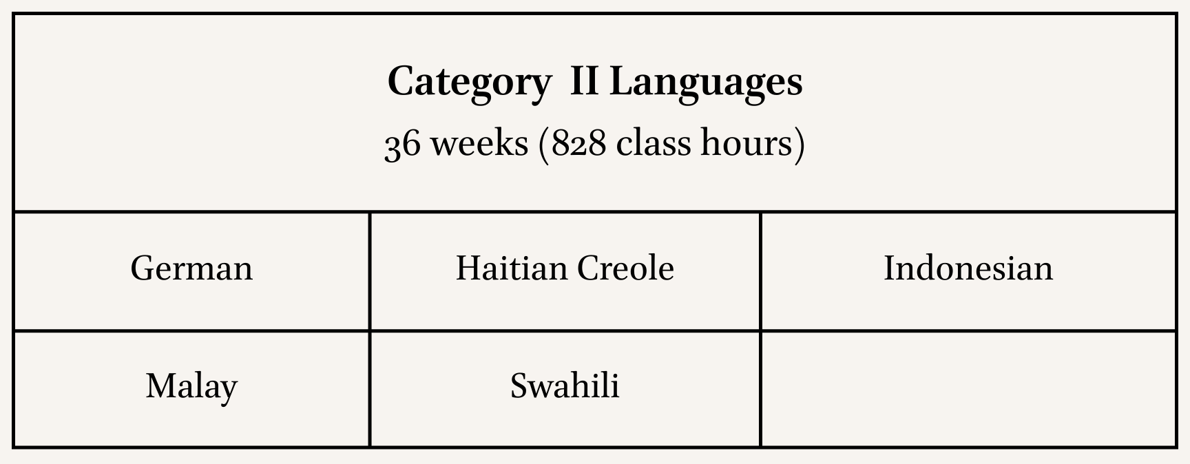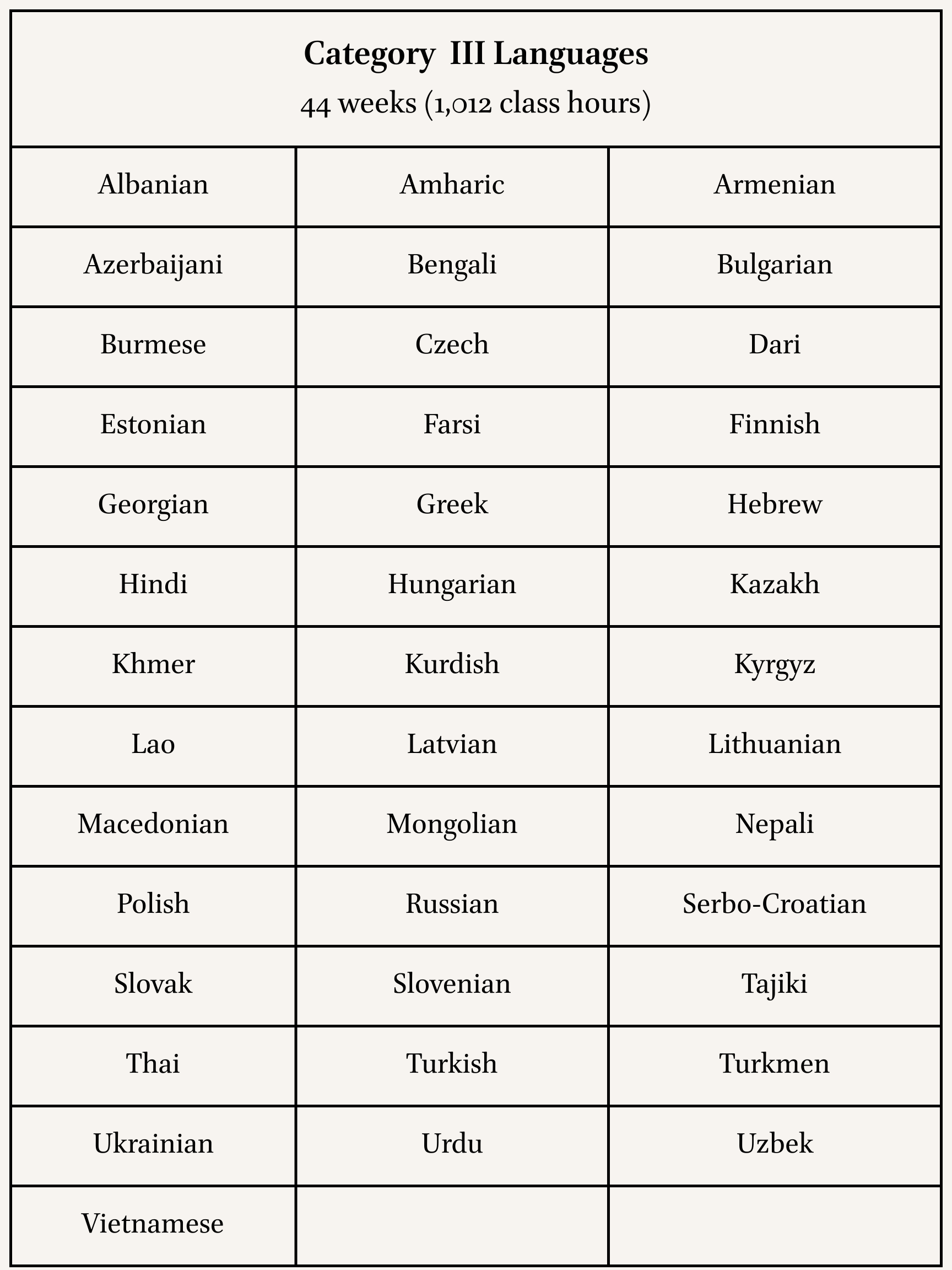 [6] Note that Category III languages are designated as “Hard” languages. The webpage states that these are “Languages with significant linguistic and/or cultural differences from English.”