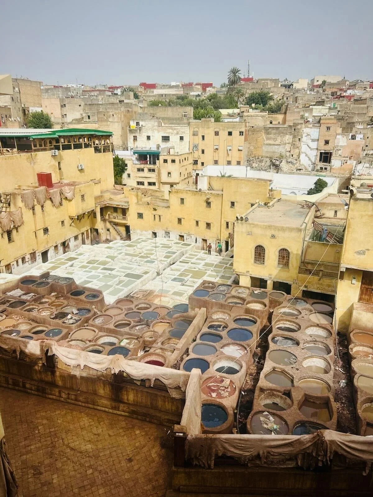 Nothing quite prepared us to walk through the tanneries. Our guide handed us each a small bunch of fresh mint leaves with a smile that suggested he knew what was coming. “Keep this near your nose,” he said. The scent became more and more pungent until we finally walked onto a balcony overlooking the Chouara Tannery, one of the oldest in Africa. From above, it was a mesmerizing sight: large circular stone vats filled with various shades of liquid, hides laid out like giant petals drying under the sun. The smell may have been overwhelming, but the preservation of this centuries-old craft was a sight worth seeing.